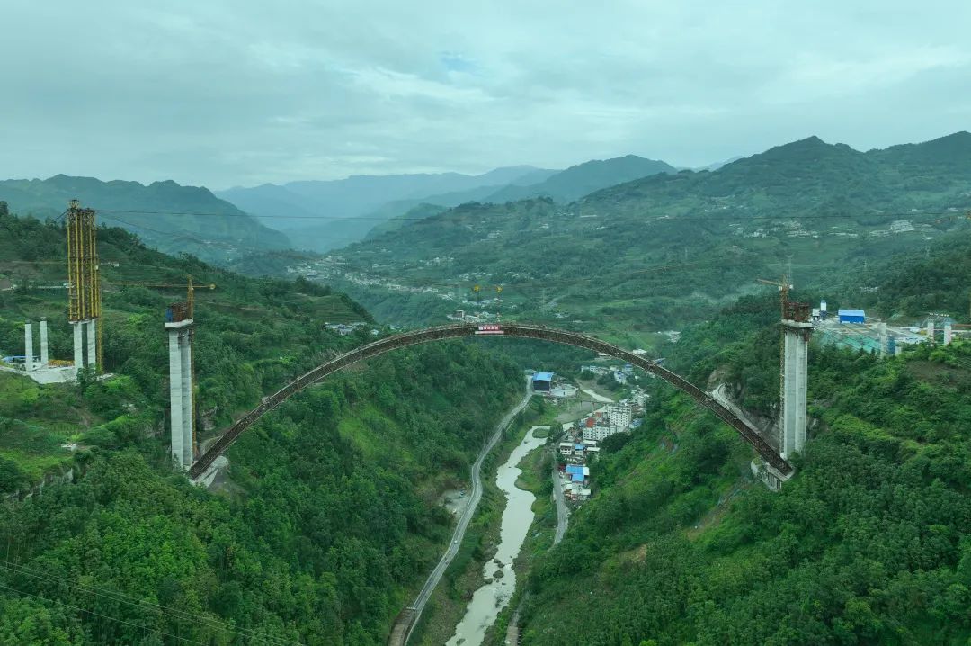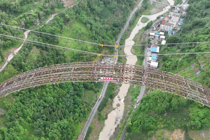 蘇壩特大橋具有“三大”特點(diǎn):一是施工難度大,主橋施工采用無(wú)支架纜索吊裝工藝,且施工區(qū)域位于陡崖地段,主橋跨越國(guó)道及縣道,施工組織難度大、風(fēng)險(xiǎn)高;二是施工作業(yè)面高,作業(yè)面距河面近300米,相當(dāng)于100層樓的高度,施工期間還面臨山區(qū)極端氣候影響;三是合龍精度高,通過(guò)精細(xì)化有限元模型仿真計(jì)算及全過(guò)程高精度測(cè)量控制,合龍段軸線誤差控制在5毫米以內(nèi),高程控制在7毫米以內(nèi),實(shí)現(xiàn)了勁性骨架高精度合龍。