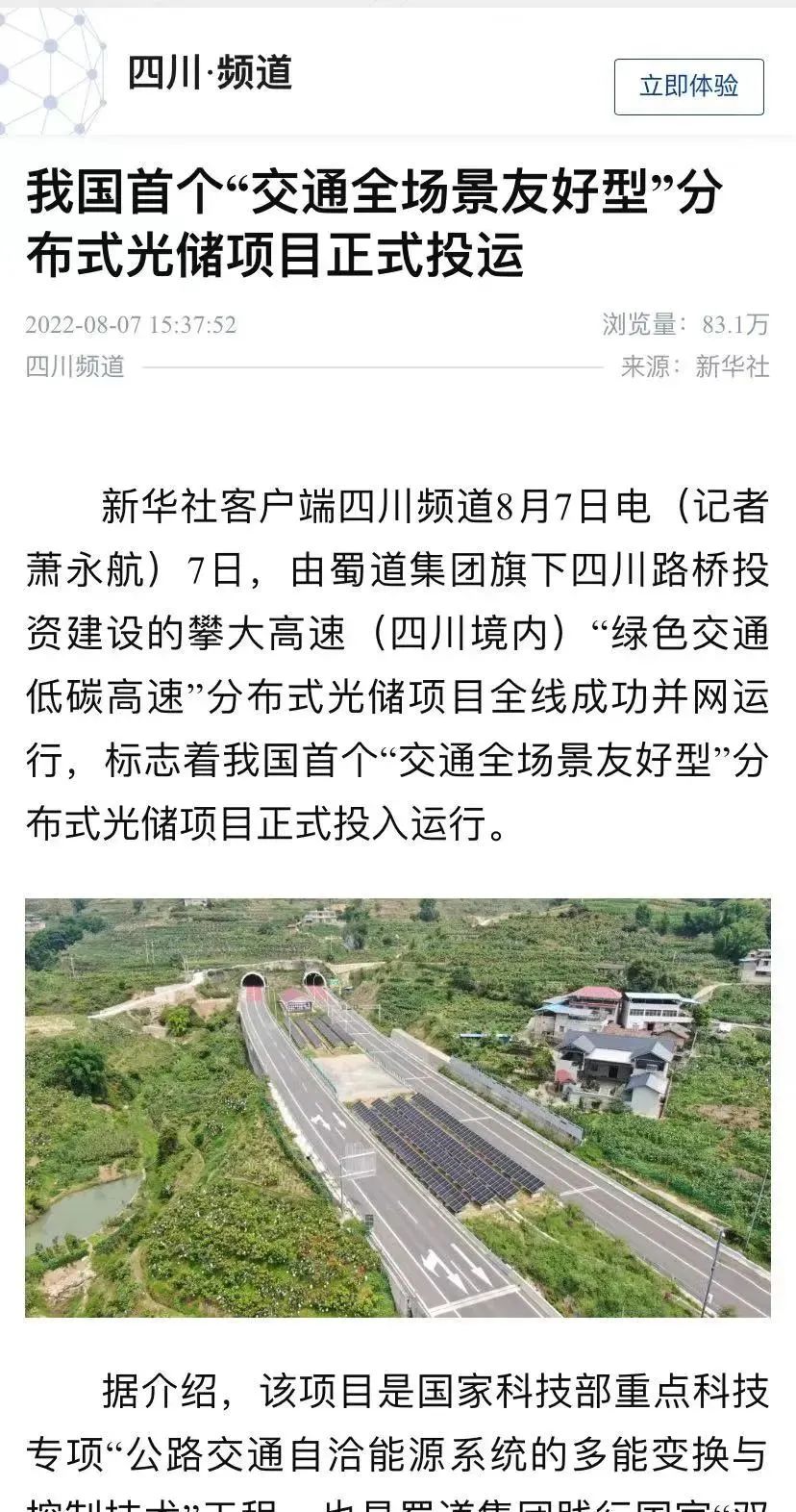 8月7日,由四川路橋清潔能源集團投資建設(shè)的攀大高速(四川境內(nèi))“綠色交通、低碳高速”分布式光儲項目全線成功并網(wǎng)運行,標志著全國首個“交通全場景友好型”分布式光儲項目正式投入運行。